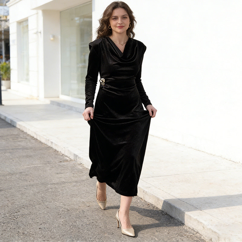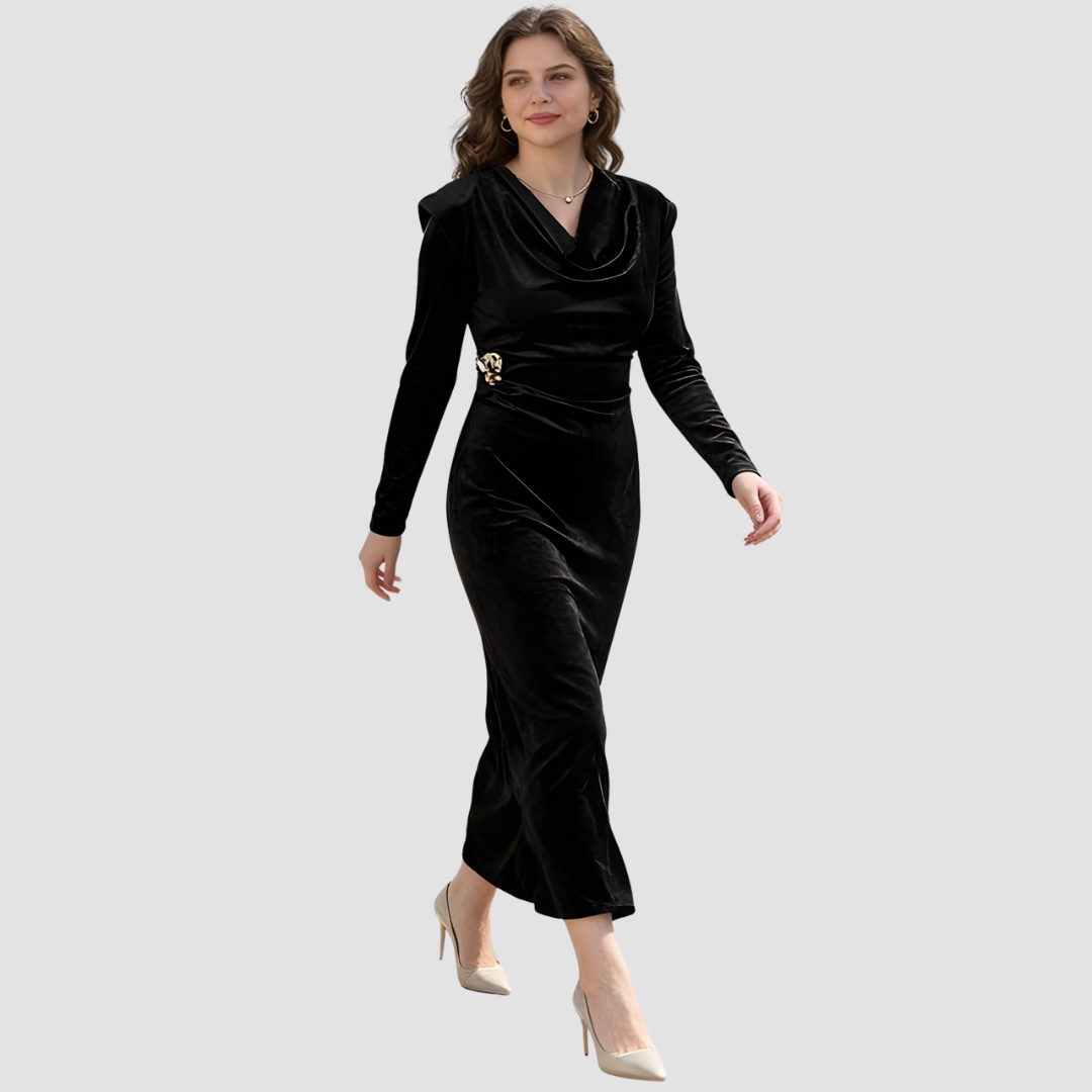 Timeless elegance meets modern refinement in the Marise Dress. Designed with a beautifully draped neckline and a flattering ruched waist, it enhances your natural silhouette while offering luxurious comfort. A polished side embellishment adds just the right touch of sparkle, making Marise the perfect choice for both special occasions and elevated everyday moments.